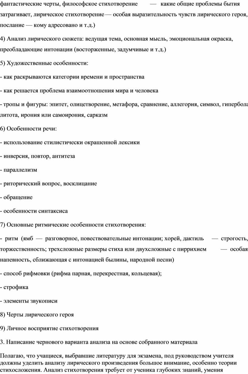 Полагаю, что учащиеся, выбравшие литературу для экзамена, под руководством учителя должны уделить анализу лирического произведения большое внимание, особенно теории стихосложения. Анализ стихотворения требует от ученика глубоких знаний, умения чувствовать слово, понимать смысл стихотворения, умения выражать свои мысли письменно. Нельзя пренебрегать и заучиванием стихотворений.
