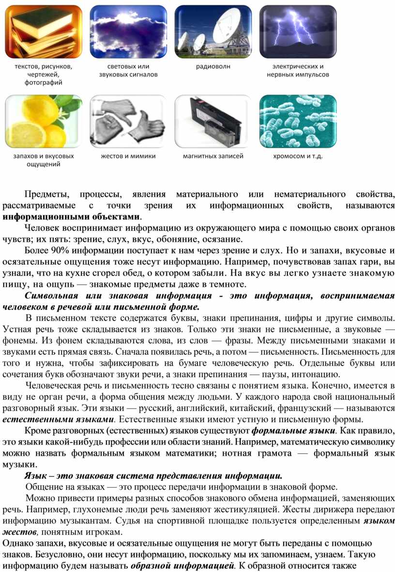 Предметы, процессы, явления материального или нематериального свойства, рассматриваемые с точки зрения их информационных свойств, называются информационными объектами.