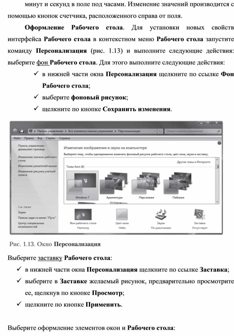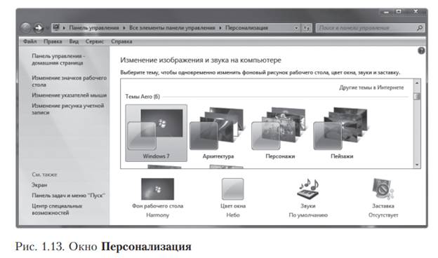 Оформление Рабочего стола. Для установки новых свойств интерфейса Рабочего стола в контекстном меню Рабочего стола запустите команду Персонализация (рис. 1.13) и выполните следующие действия: выберите фон Рабочего стола. Для этого выполните следующие действия: