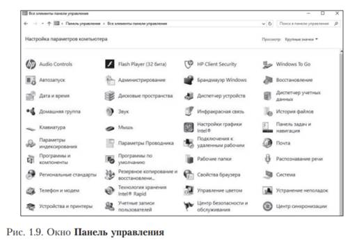 Windows — операционная система с графическим интерфейсом, и эта система имеет особые средства для взаимодействия человека с компьютером. Эти средства позволяют сделать работу с системой и ее приложениями наглядной — в виде экранных окон. Они обеспечивают комфорт и удобство в работе, а значит, влияют на производительность труда. Окно Панель управления представляет собой основное средство для проведения различных настроек компьютера (рис. 1.9).