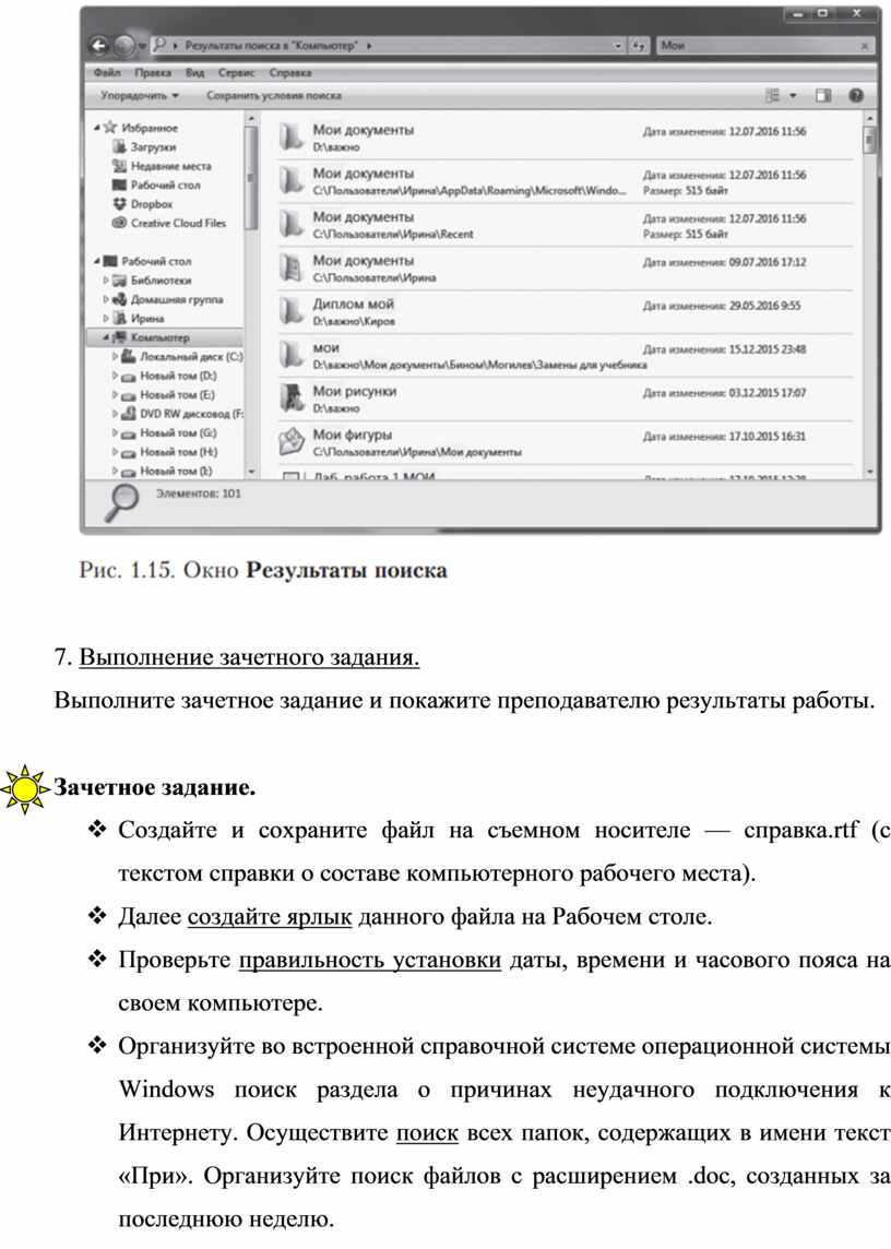 v Организуйте во встроенной справочной системе операционной системы Windows поиск раздела о причинах неудачного подключения к Интернету. Осуществите поиск всех папок, содержащих в имени текст «При». Организуйте поиск файлов с расширением .doc, созданных за последнюю неделю.