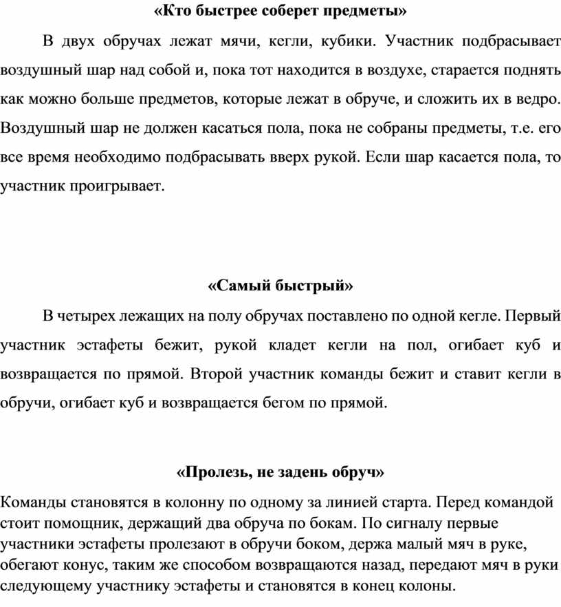 В двух обручах лежат мячи, кегли, кубики. Участник подбрасывает воздушный шар над собой и, пока тот находится в воздухе, старается поднять как можно больше предметов, которые лежат в обруче, и сложить их в ведро. Воздушный шар не должен касаться пола, пока не собраны предметы, т.е. его все время необходимо подбрасывать вверх рукой. Если шар касается пола, то участник проигрывает.