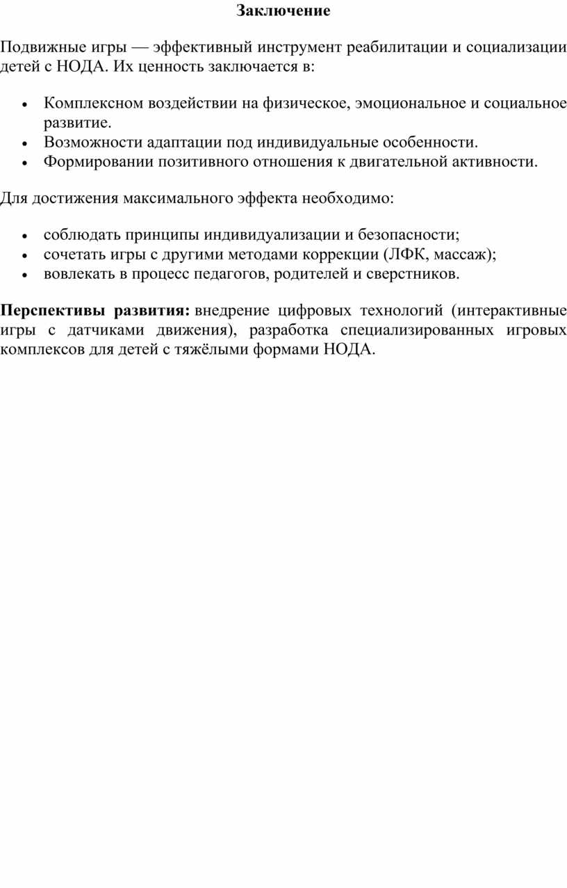 Перспективы развития: внедрение цифровых технологий (интерактивные игры с датчиками движения), разработка специализированных игровых комплексов для детей с тяжёлыми формами НОДА.