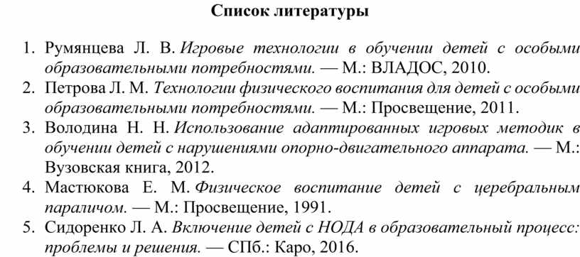 2. Петрова Л. М. Технологии физического воспитания для детей с особыми образовательными потребностями. — М.: Просвещение, 2011.