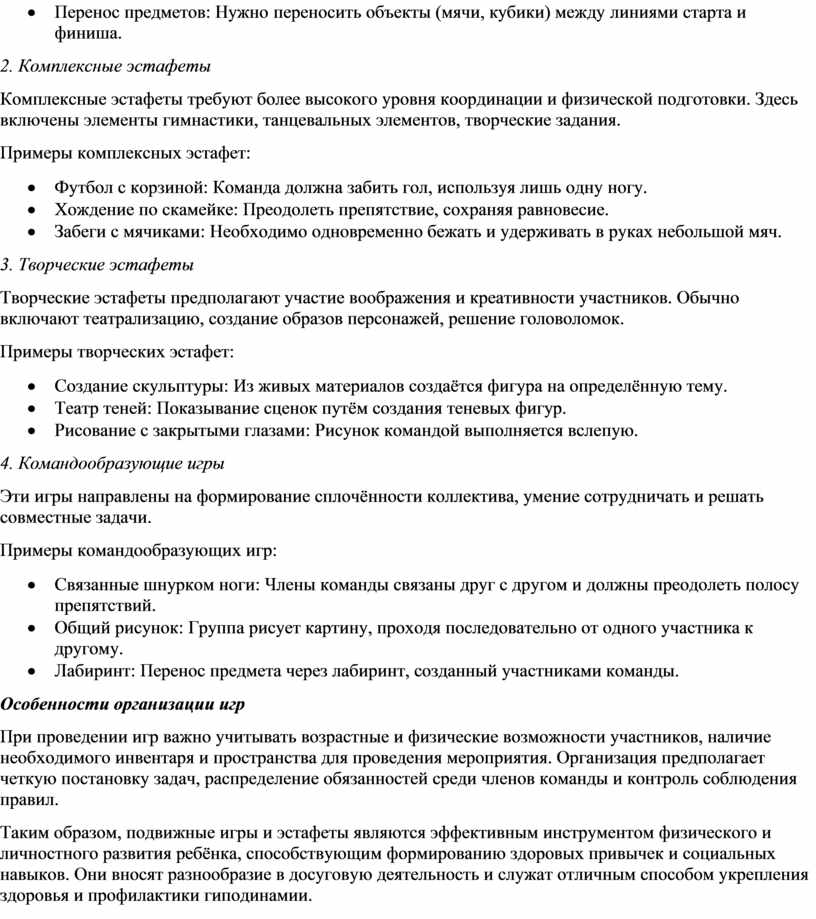 Таким образом, подвижные игры и эстафеты являются эффективным инструментом физического и личностного развития ребёнка, способствующим формированию здоровых привычек и социальных навыков. Они вносят разнообразие в досуговую деятельность и служат отличным способом укрепления здоровья и профилактики гиподинамии.