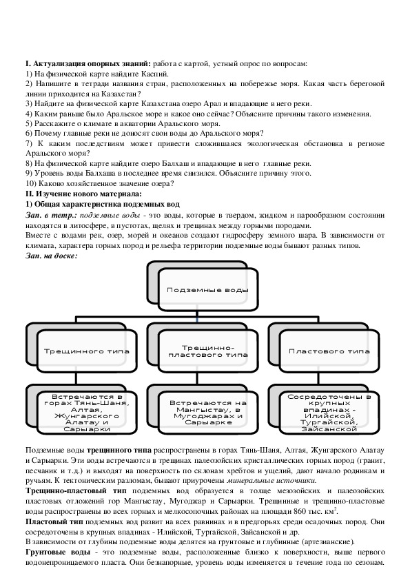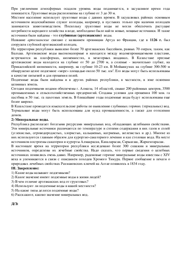 1) Ознакомление учащихся с условиями образования и основными типами подземных вод в Казахстане.