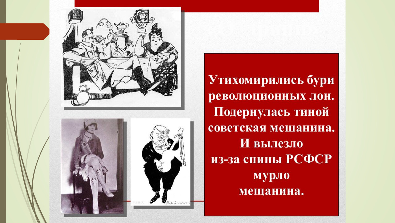 Но вот война окончена. Покончено с внешними врагами, но появились внутренние враги, которые оказались опаснее внешних. Эпоху военного коммунизма сменяет эпоха НЭПа. С НЭПом оживает новое советское мещанство.