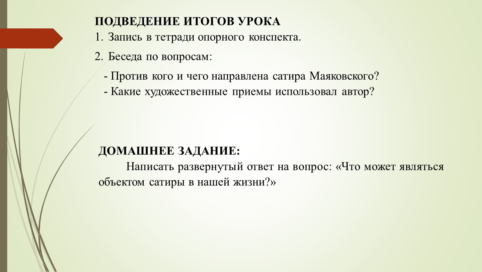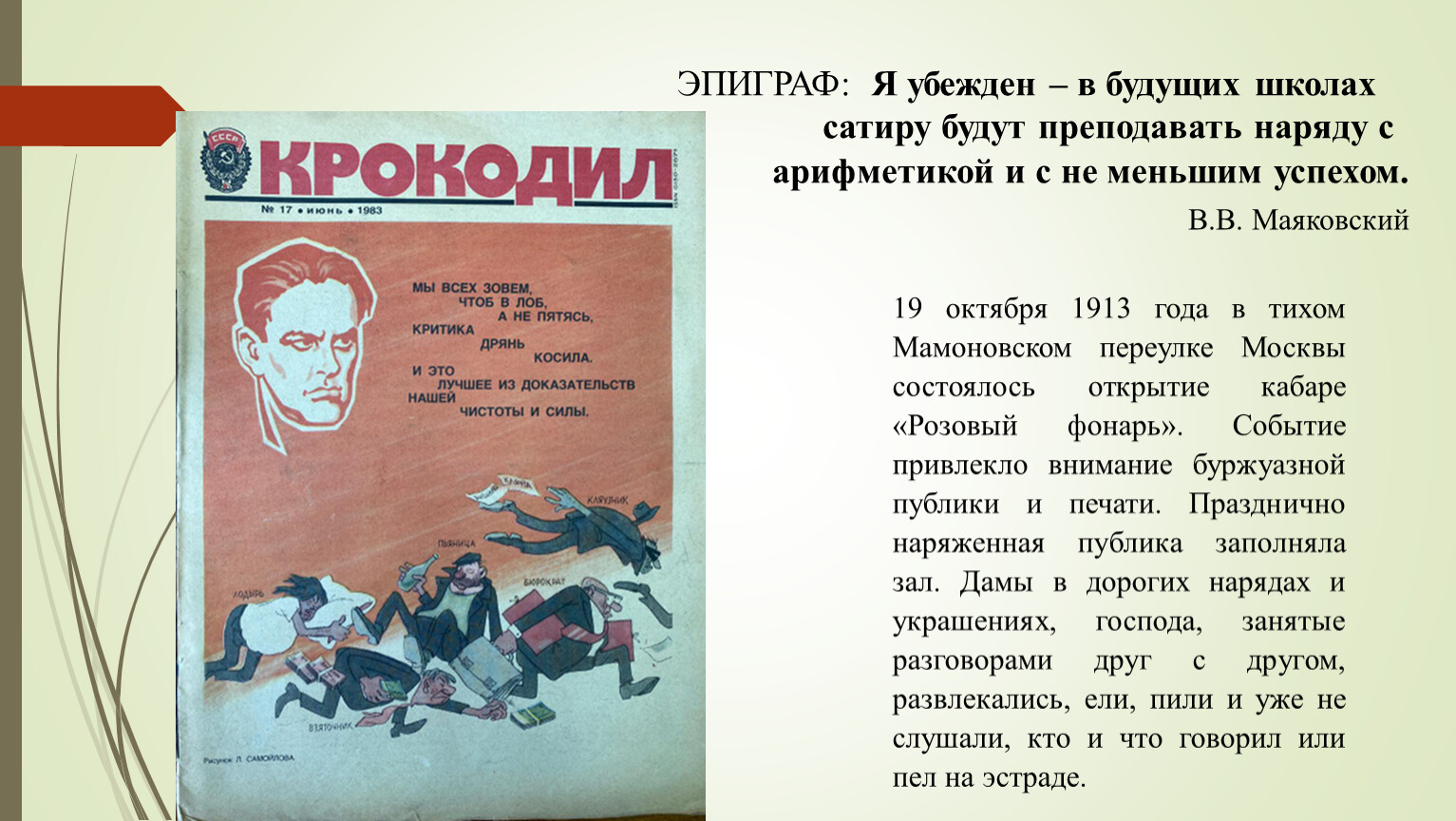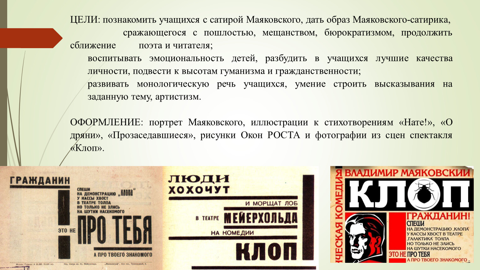 ЦЕЛИ: познакомить учащихся с сатирой Маяковского, дать образ Маяковского-сатирика,