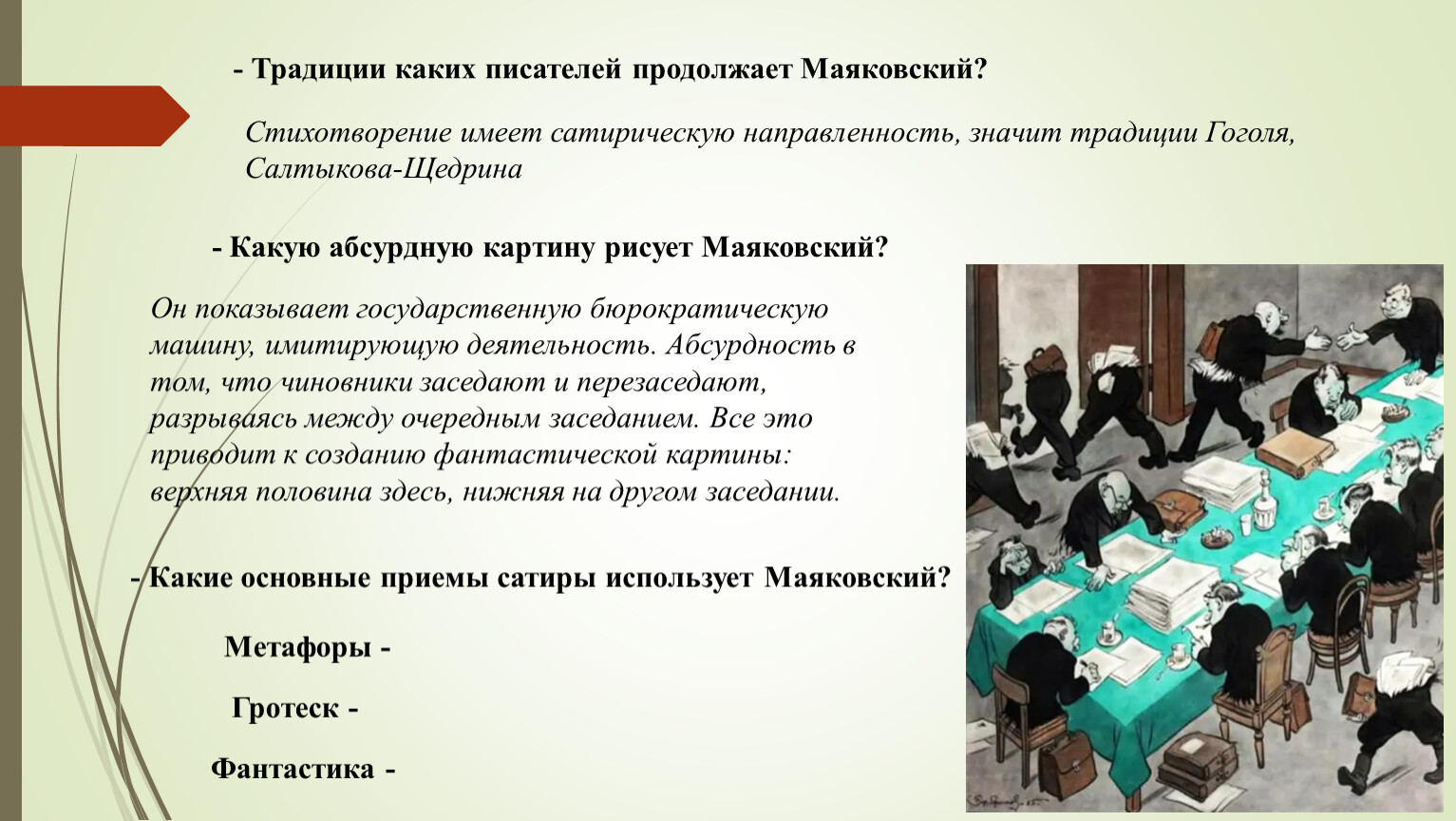 МЕЩАНСТВО, БЮРОКРАТИЗМ | САТИРА НА ВНУТРЕННИХ ВРАГОВ: «МАРУСЯ ОТРАВИЛАСЬ», «СТОЛП», «СПЛЕТНИК», «О ДРЯНИ», «ПРОЗАСЕДАВШИЕСЯ» | ГРОТЕСК | |