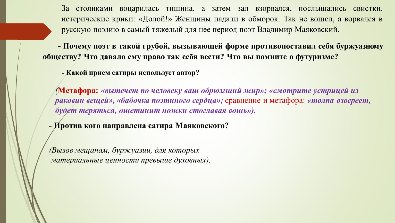- Почему поэт в такой грубой, вызывающей форме противопоставил себя буржуазному обществу? Что давало ему право так себя вести? Что вы помните о футуризме?