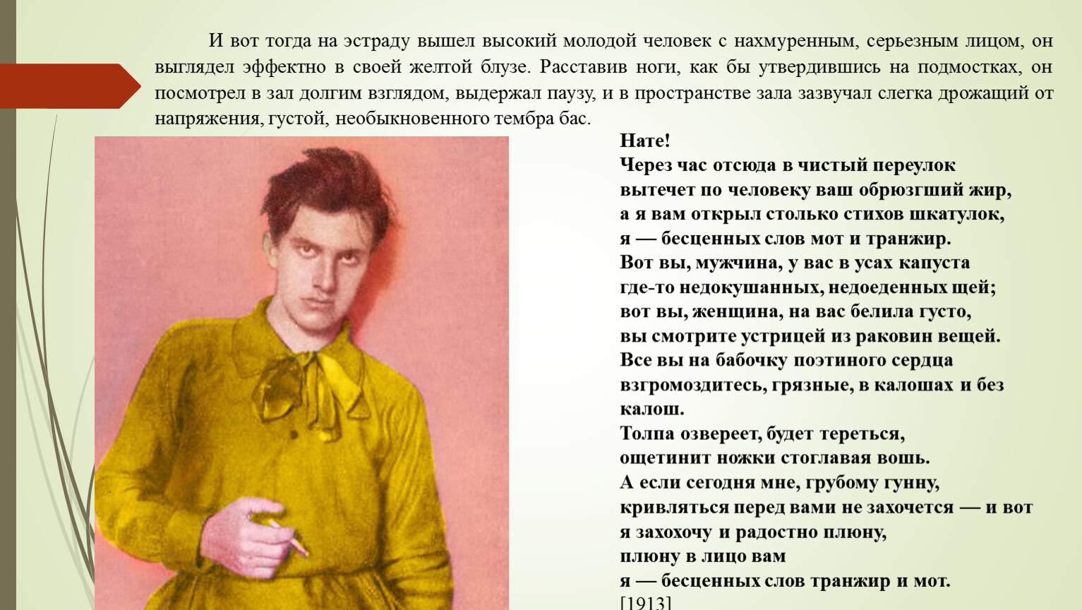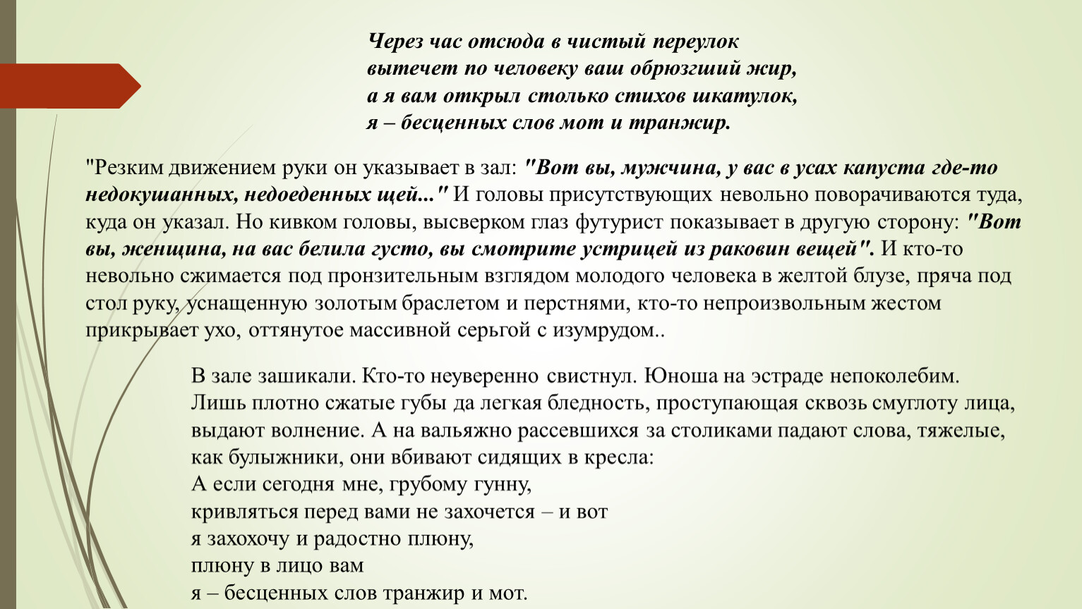 "Резким движением руки он указывает в зал: "Вот вы, мужчина, у вас в усах капуста где-то недокушанных, недоеденных щей..." И головы присутствующих невольно поворачиваются туда, куда он указал. Но кивком головы, высверком глаз футурист показывает в другую сторону: "Вот вы, женщина, на вас белила густо, вы смотрите устрицей из раковин вещей". И кто-то невольно сжимается под пронзительным взглядом молодого человека в желтой блузе, пряча под стол руку, уснащенную золотым браслетом и перстнями, кто-то непроизвольным жестом прикрывает ухо, оттянутое массивной серьгой с изумрудом..