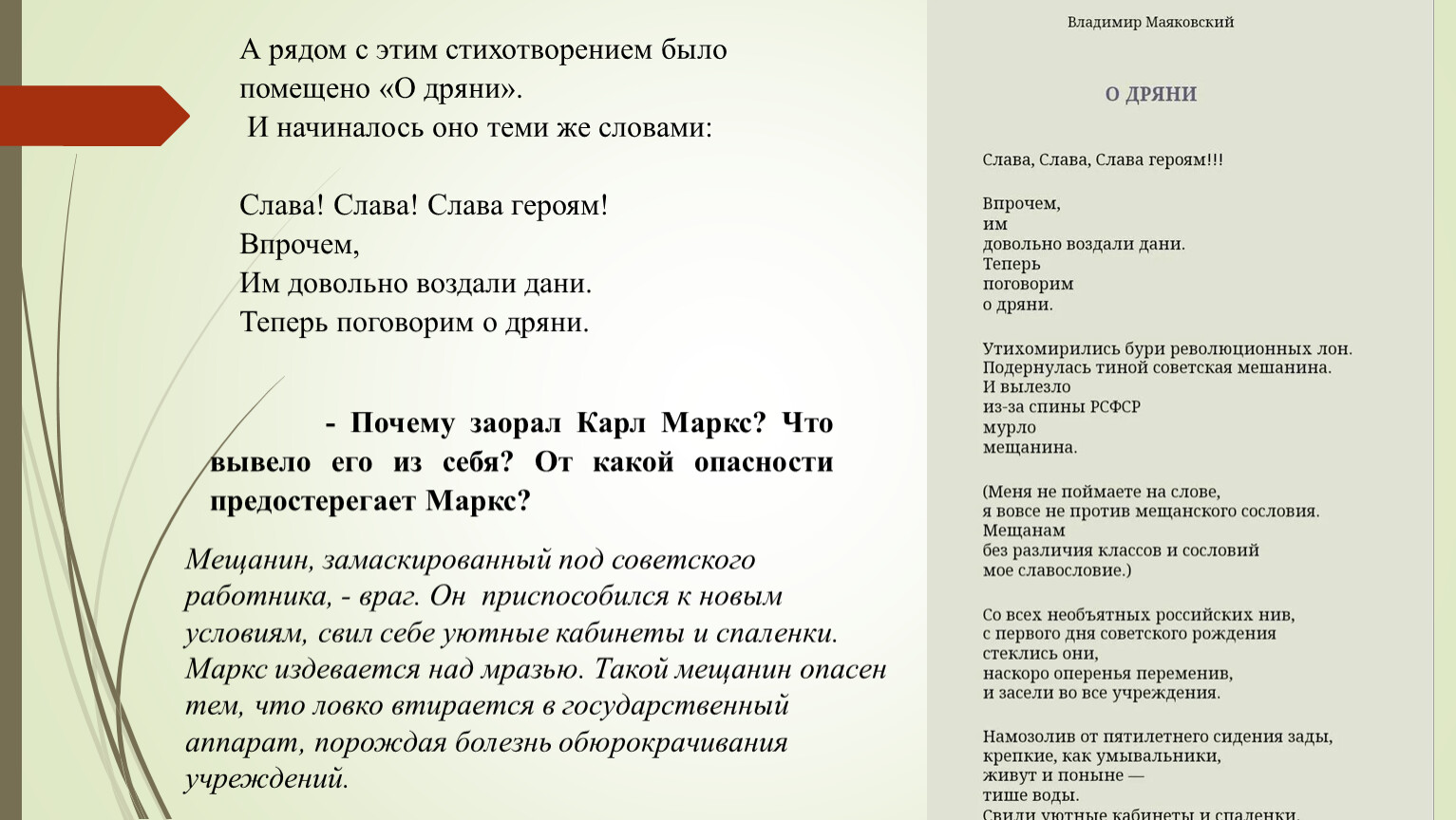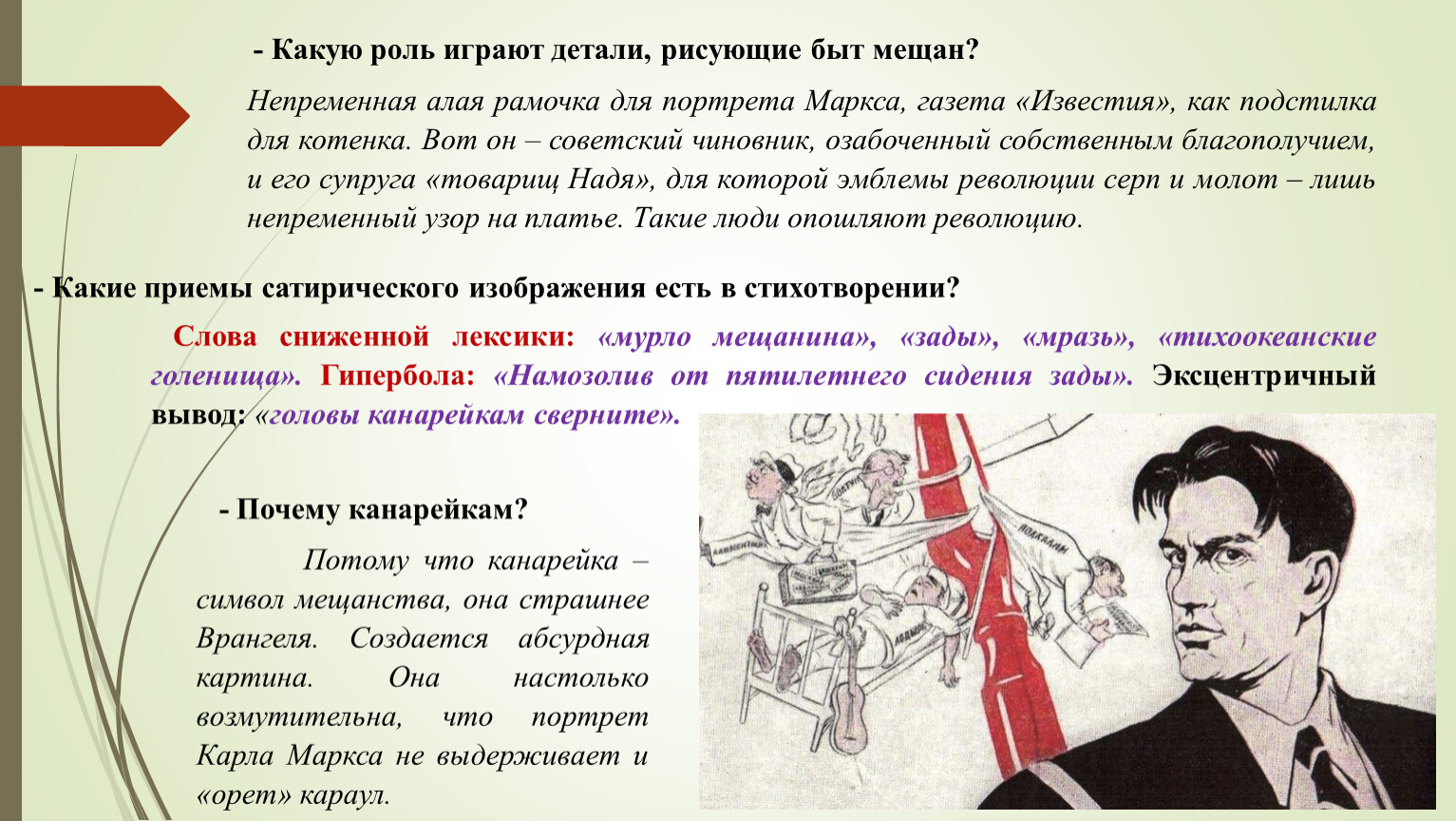 Мещанин, замаскированный под советского работника, - враг. Он приспособился к новым условиям, свил себе уютные кабинеты и спаленки. Маркс издевается над мразью. Такой мещанин опасен тем, что ловко втирается в государственный аппарат, порождая болезнь обюрокрачивания учреждений.