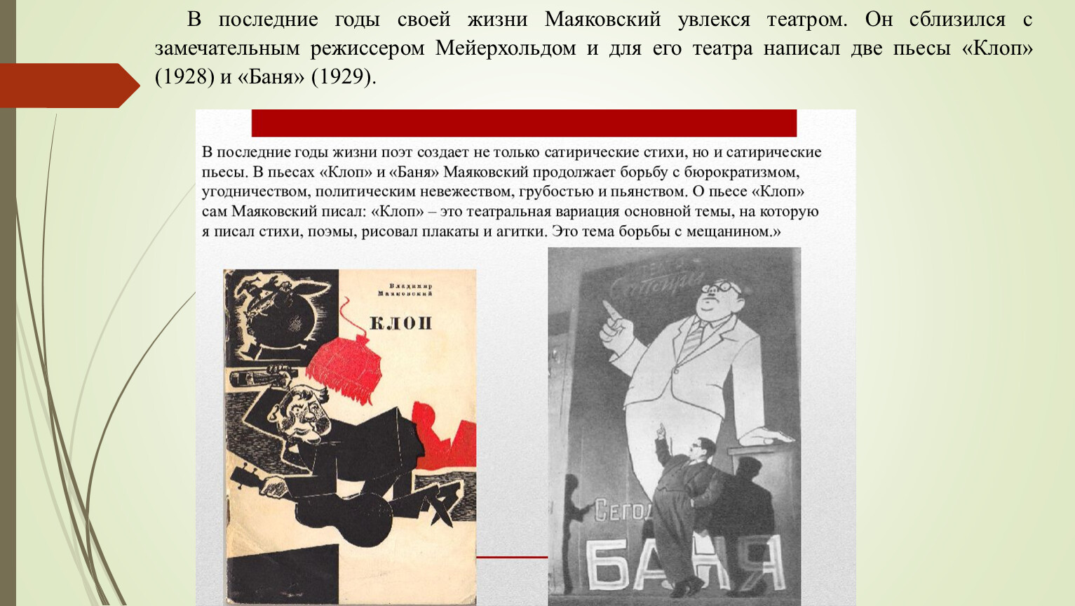 В последние годы своей жизни Маяковский увлекся театром. Он сблизился с замечательным режиссером Мейерхольдом и для его театра написал две пьесы «Клоп» (1928) и «Баня» (1929).