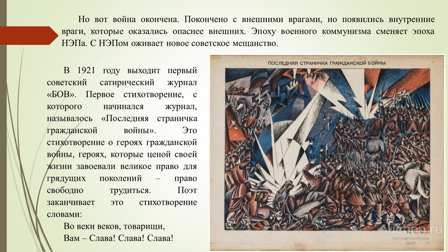В 1921 году выходит первый советский сатирический журнал «БОВ». Первое стихотворение, с которого начинался журнал, называлось «Последняя страничка гражданской войны». Это стихотворение о героях гражданской войны, героях, которые ценой своей жизни завоевали великое право для грядущих поколений – право свободно трудиться. Поэт заканчивает это стихотворение словами: