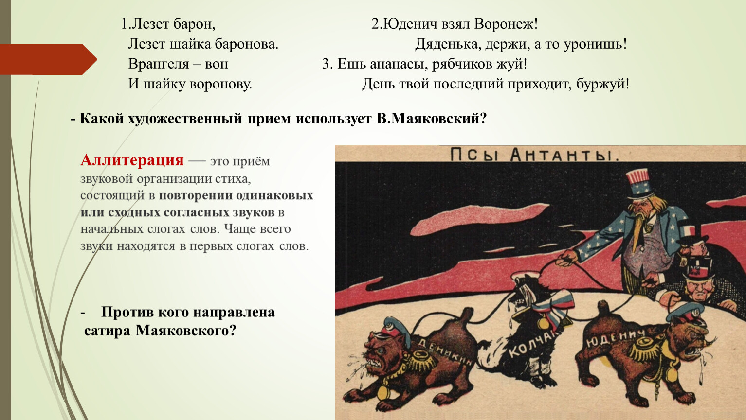 ВРАГИ РЕВОЛЮЦИИ | САТИРА НА ВНЕШНИХ ВРАГОВ: ДЕНИКИН, ЮДЕНИЧ, АНТАНТА | АЛЛИТЕРАЦИЯ | |
