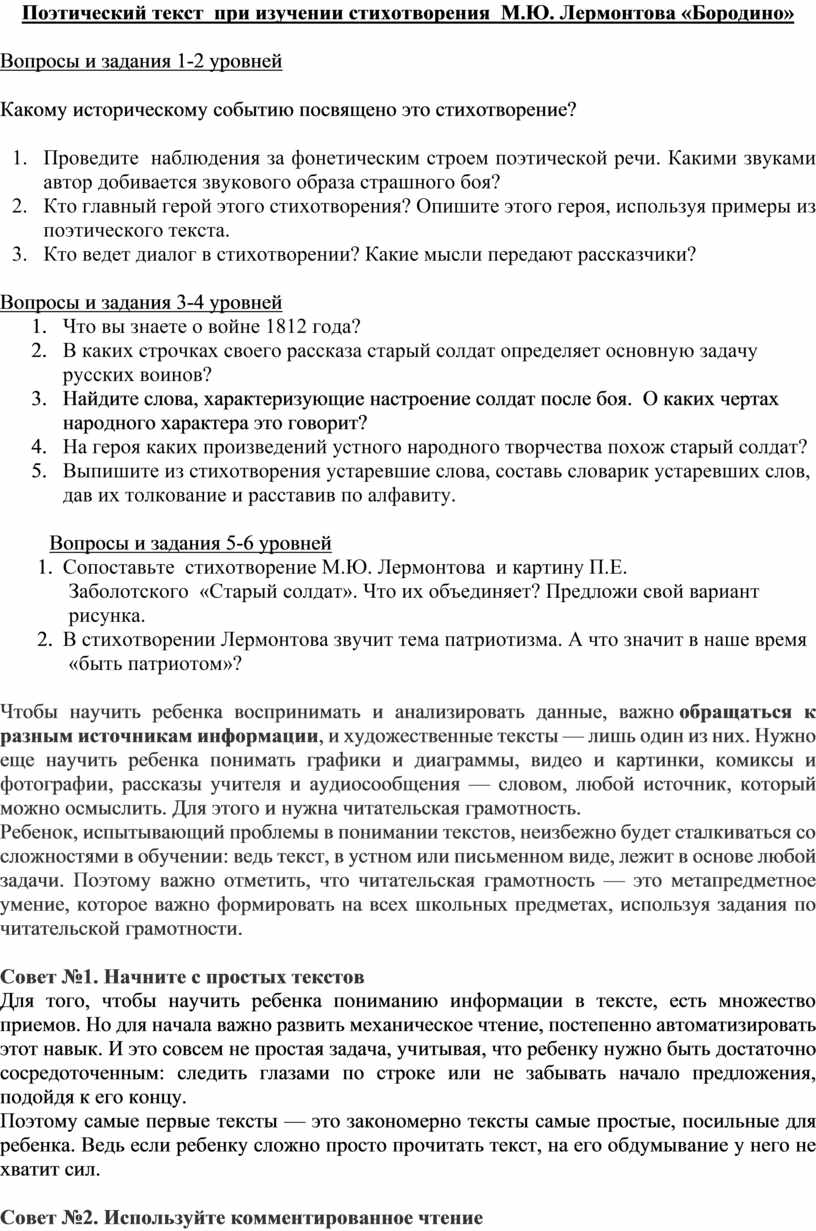 Поэтический текст при изучении стихотворения М.Ю. Лермонтова «Бородино»