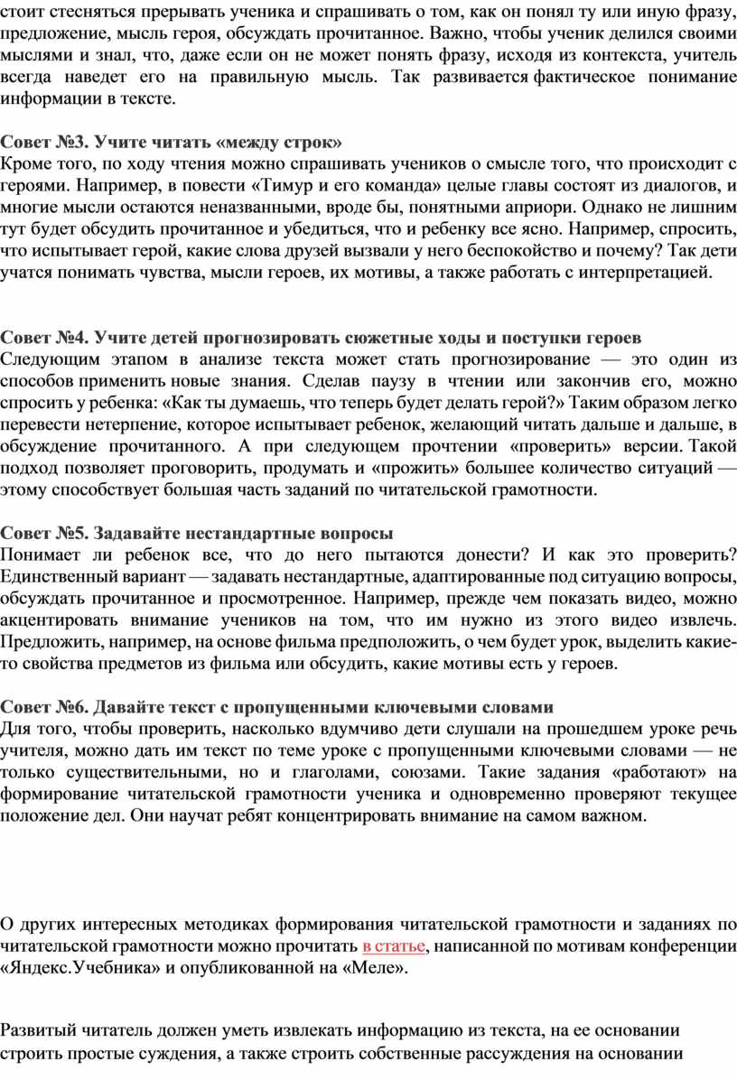 О других интересных методиках формирования читательской грамотности и заданиях по читательской грамотности можно прочитать в статье, написанной по мотивам конференции «Яндекс.Учебника» и опубликованной на «Меле».