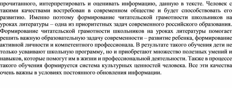 Развитый читатель должен уметь извлекать информацию из текста, на ее основании строить простые суждения, а также строить собственные рассуждения на основании прочитанного, интерпретировать и оценивать информацию, данную в тексте. Человек с такими качествами востребован в современном обществе и будет способствовать его развитию. Именно поэтому формирование читательской грамотности школьников на уроках литературы – одна из приоритетных задач современного российского образования. Формирование читательской грамотности школьников на уроках литературы помогает решить важную образовательную задачу современности – развитие ребенка, формирование активной личности и компетентного профессионала. В результате такого обучения дети не только усваивают школьную программу, но и приобретают множество полезных умений и навыков, которые помогут им в жизни и профессиональной деятельности. Также в процессе такого обучения формируется система культурных ценностей человека. Все эти качества очень важны в условиях постоянного обновления информации.