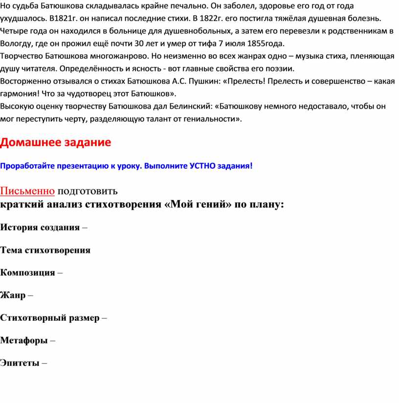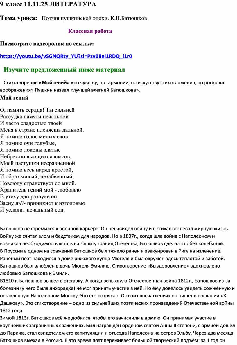 Тема урока: Поэзия пушкинской эпохи. К.Н.Батюшков
