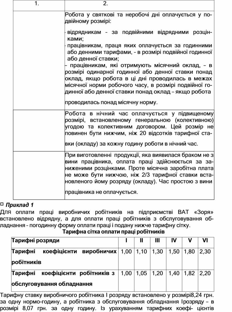 Тарифну ставку виробничого робітника І розряду встановлено у розмірі 8,24 грн. за одну нормо-годину, а робітника з обслуговування обладнання І розряду – в розмірі 8,07 грн. за одну годину. Із урахуванням тарифних коефі- цієнтів розраховують решту тарифних ставок робітників ВАТ «Зоря».