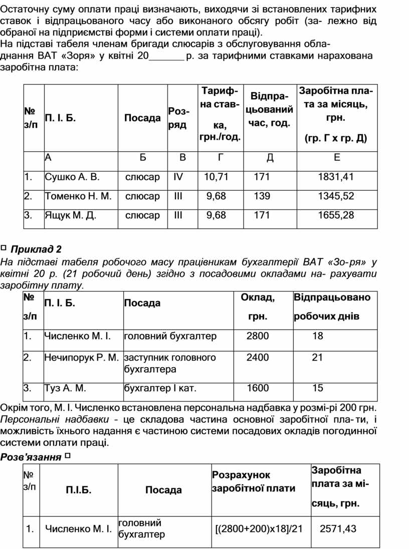 На підставі табеля робочого масу працівникам бухгалтерії ВАТ «Зо- ря» у квітні 20 р. (21 робочий день) згідно з посадовими окладами на- рахувати заробітну плату.