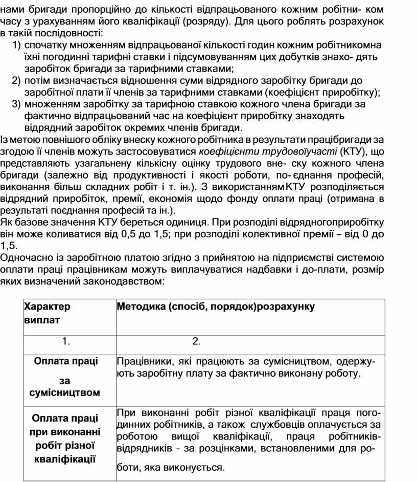 Із метою повнішого обліку внеску кожного робітника в результати праці бригади за згодою її членів можуть застосовуватися коефіцієнти трудової участі (КТУ), що представляють узагальнену кількісну оцінку трудового вне- ску кожного члена бригади (залежно від продуктивності і якості роботи, по- єднання професій, виконання більш складних робіт і т. ін.). З використанням КТУ розподіляється відрядний приробіток, премії, економія щодо фонду оплати праці (отримана в результаті поєднання професій та ін.).