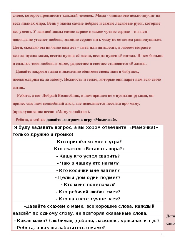 Ребята, а сейчас давайте поиграем в игру «Мамочка!».