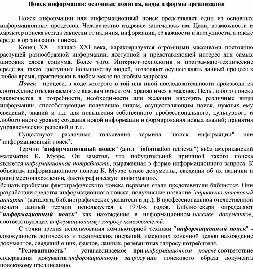 Поиск информации: основные понятия, виды и формы организации