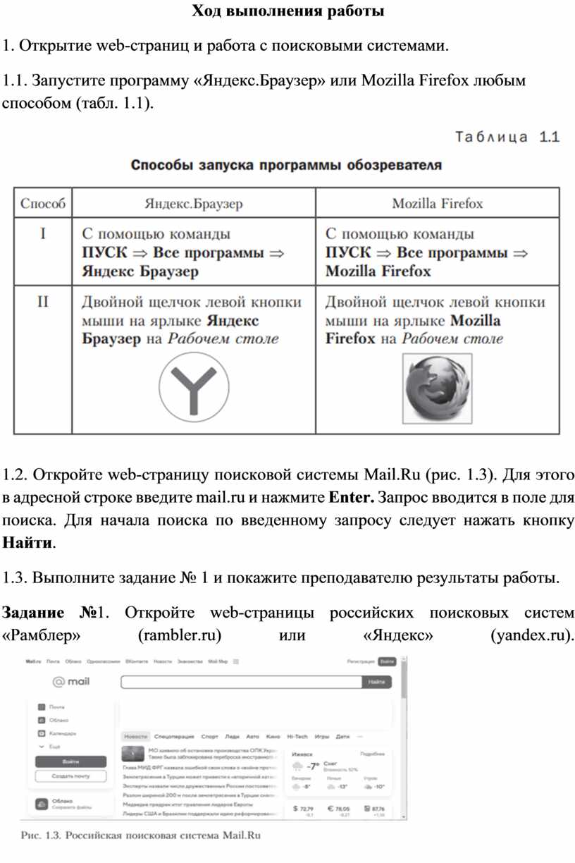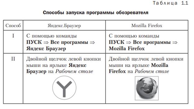 1.1. Запустите программу «Яндекс.Браузер» или Mozilla Firefox любым способом (табл. 1.1).
