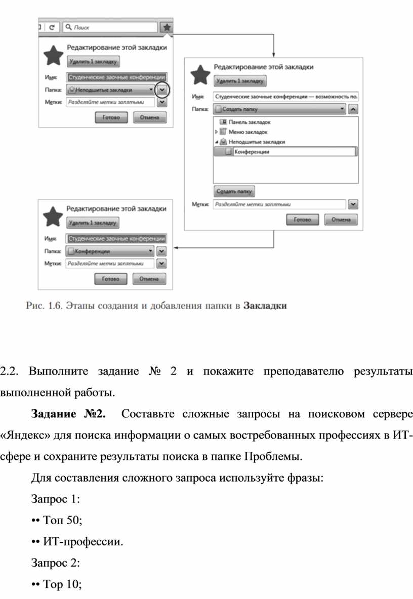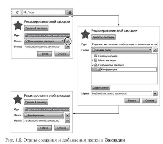 ü в появившемся окне Редактирование этой закладки щелкните по кнопке Показать все папки закладок, затем нажмите кнопку Создать папку, введите название новой папки Конференции и щелкните по кнопке Готово (рис. 1.6);