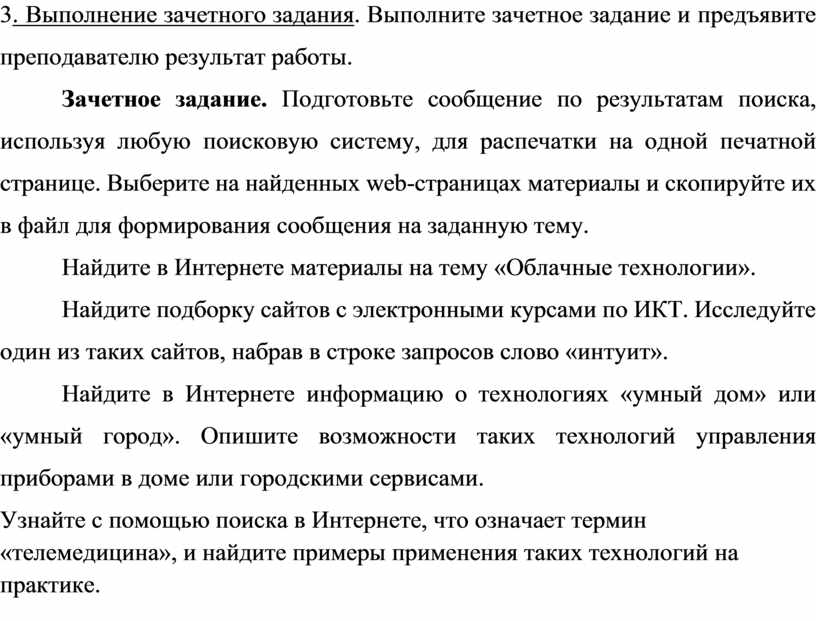 Зачетное задание. Подготовьте сообщение по результатам поиска, используя любую поисковую систему, для распечатки на одной печатной странице. Выберите на найденных web-страницах материалы и скопируйте их в файл для формирования сообщения на заданную тему.