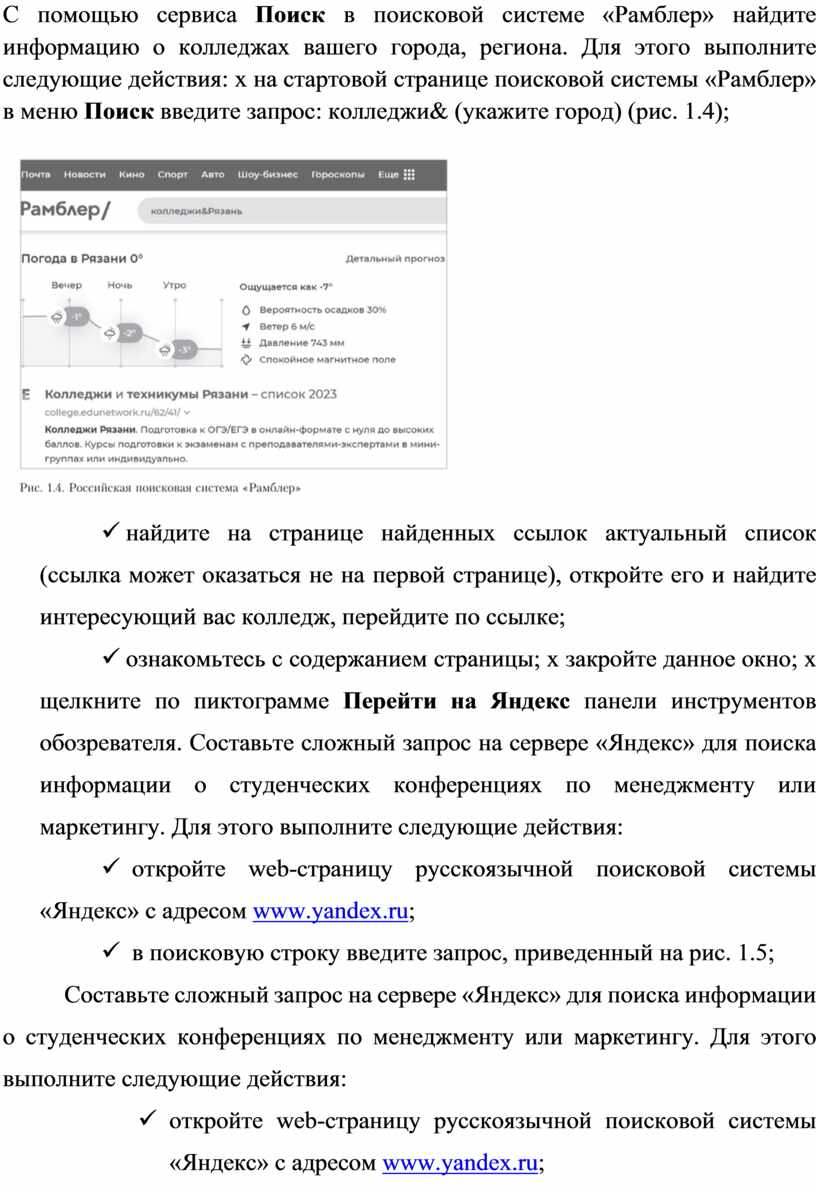 С помощью сервиса Поиск в поисковой системе «Рамблер» найдите информацию о колледжах вашего города, региона. Для этого выполните следующие действия: x на стартовой странице поисковой системы «Рамблер» в меню Поиск введите запрос: колледжи& (укажите город) (рис. 1.4);