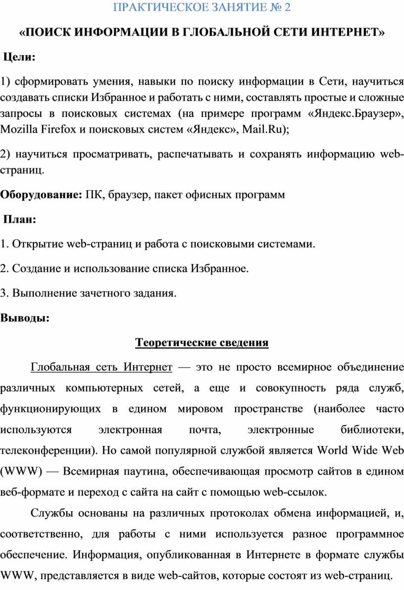 1) сформировать умения, навыки по поиску информации в Сети, научиться создавать списки Избранное и работать с ними, составлять простые и сложные запросы в поисковых системах (на примере программ «Яндекс.Браузер», Mozilla Firefox и поисковых систем «Яндекс», Mail.Ru);