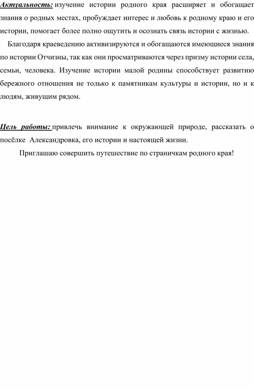 Актуальность: изучение истории родного края расширяет и обогащает знания о родных местах, пробуждает интерес и любовь к родному краю и его истории, помогает более полно ощутить и осознать связь истории с жизнью.