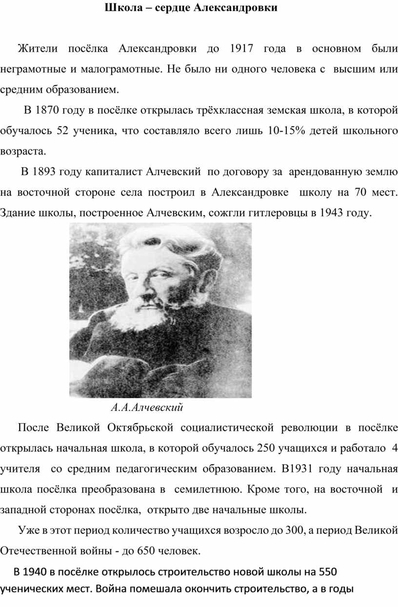 Александровке школу на 70 мест. Здание школы, построенное Алчевским, сожгли