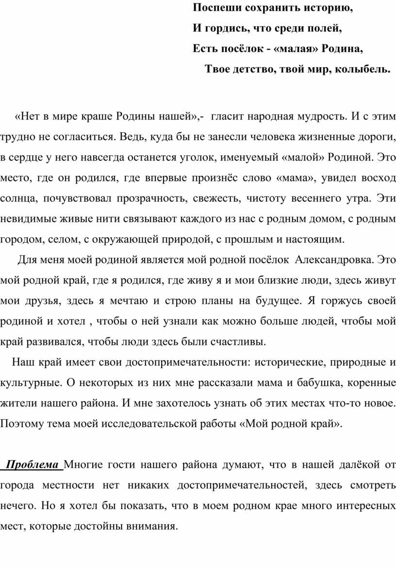 Наш край имеет свои достопримечательности: исторические, природные и культурные. О некоторых из них мне рассказали мама и бабушка, коренные жители нашего района. И мне захотелось узнать об этих местах что-то новое. Поэтому тема моей исследовательской работы «Мой родной край».