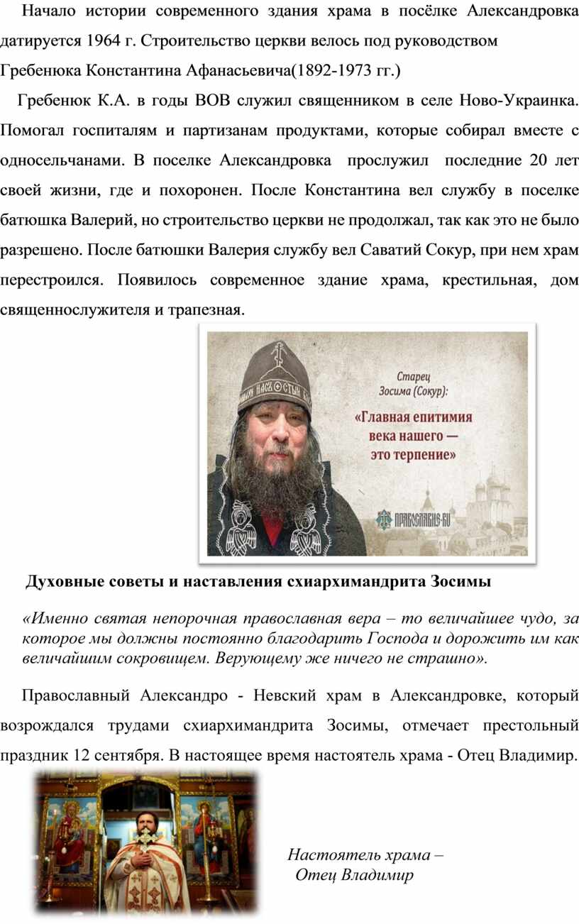 Зосимы, отмечает престольный праздник 12 сентября. В настоящее время настоятель