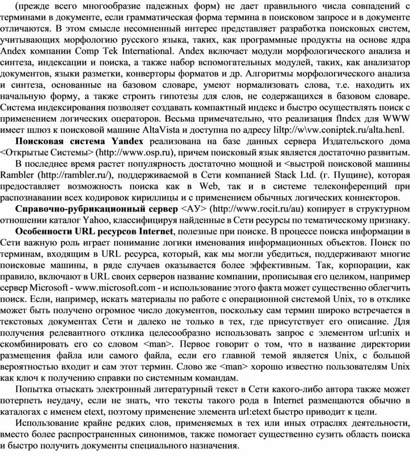 Особенности URL ресурсов Internet, полезные при поиске. В процессе поиска информации в Сети важную роль играет понимание логики именования информационных объектов. Поиск по терминам, входящим в URL ресурса, который, как мы могли убедиться, поддерживают многие поисковые машины, в ряде случаев оказывается более эффективным. Так, корпорации, как правило, включают в URL своих серверов название компании, прописывая его целиком, например сервер Microsoft - www.microsoft.com - и использование этого факта может существенно облегчить поиск. Если, например, искать материалы по работе с операционной системой Unix, то в отклике может быть получено огромное число документов, поскольку сам термин широко встречается в текстовых документах Сети и далеко не только в тех, где присутствует его описание. Для получения релевантного отклика целесообразно использовать запрос с элементом url:unix и скомбинировать его со словом <man>. Первое говорит о том, что в название директории размещения файла или самого файла, если его главной темой является Unix, с большой вероятностью входит и сам этот термин. Слово же <man> хорошо известно пользователям Unix как ключ к получению справки по системным командам.