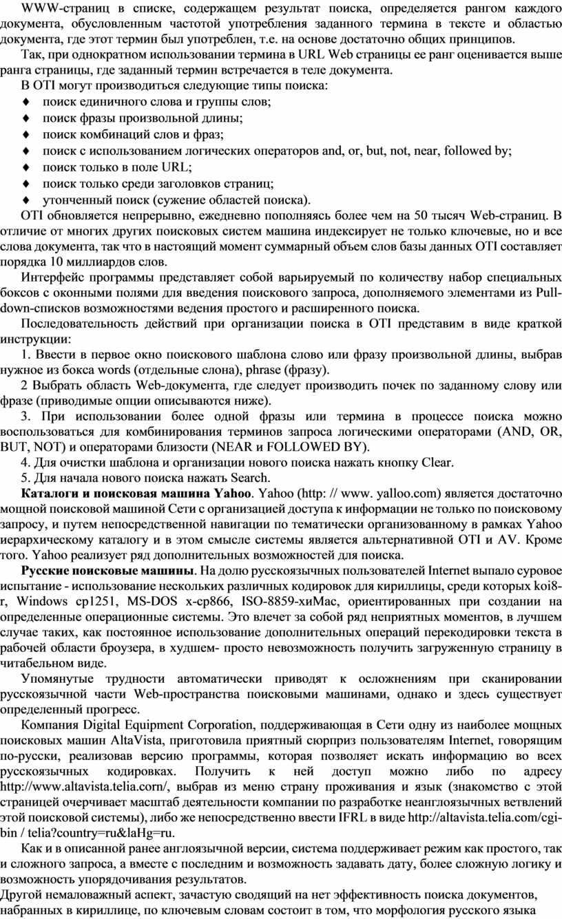 Каталоги и поисковая машина Yahoo. Yahoo (http: // www. yalloo.com) является достаточно мощной поисковой машиной Сети с организацией доступа к информации не только по поисковому запросу, и путем непосредственной навигации по тематически организованному в рамках Yahoo иерархическому каталогу и в этом смысле системы является альтернативной OTI и AV. Кроме того. Yahoo реализует ряд дополнительных возможностей для поиска.