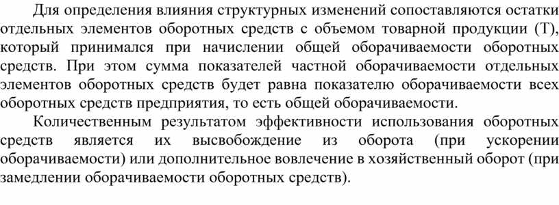 Для определения влияния структурных изменений сопоставляются остатки отдельных элементов оборотных средств с объемом товарной продукции (Т), который принимался при начислении общей оборачиваемости оборотных средств. При этом сумма показателей частной оборачиваемости отдельных элементов оборотных средств будет равна показателю оборачиваемости всех оборотных средств предприятия, то есть общей оборачиваемости.