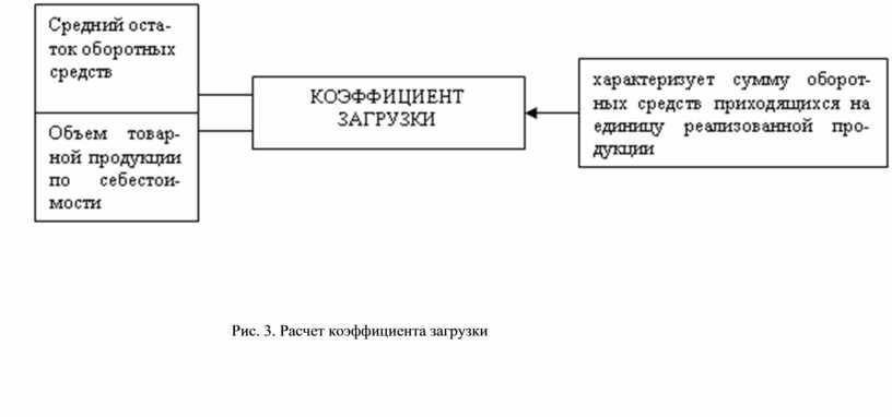 Коэффициент загрузки оборотных средств – это показатель обратный коэффициенту оборачиваемости (рис. 3). Он характеризует величину оборотных средств, приходящихся на единицу (1 руб., 1 тыс. руб., 1 млн. руб.) реализованной продукции. По своей сути этот показатель представляет фондоемкость оборотных средств и рассчитывается как отношение среднего остатка оборотных средств к объему реализации продукции за анализируемый период. Исчисляется по формуле: