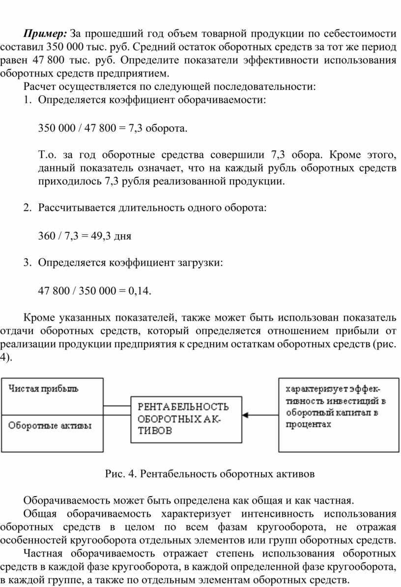 Пример: За прошедший год объем товарной продукции по себестоимости составил 350 000 тыс. руб. Средний остаток оборотных средств за тот же период равен 47 800 тыс. руб. Определите показатели эффективности использования оборотных средств предприятием.