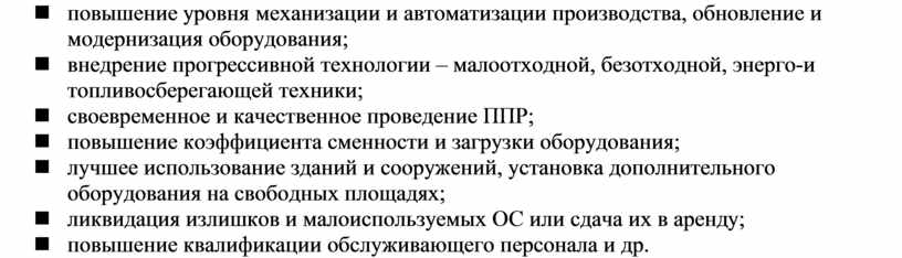 n повышение уровня механизации и автоматизации производства, обновление и модернизация оборудования;
