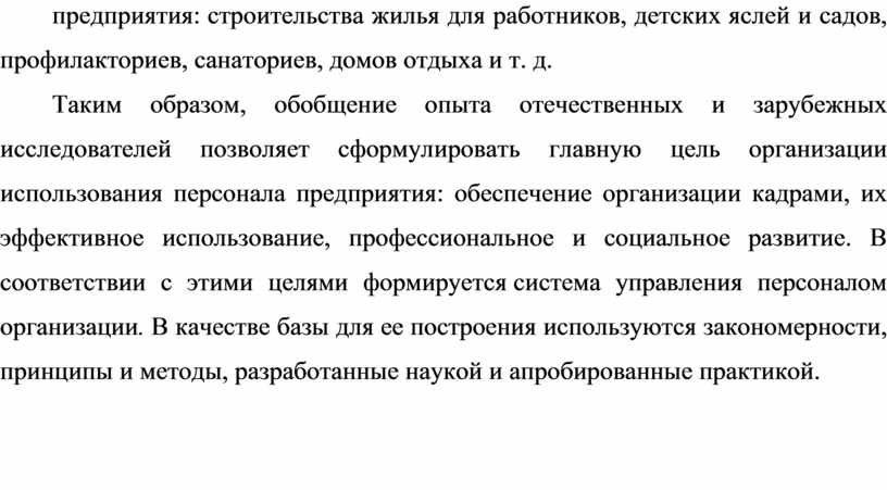 Таким образом, обобщение опыта отечественных и зарубежных исследователей позволяет сформулировать главную цель организации использования персонала предприятия: обеспечение организации кадрами, их эффективное использование, профессиональное и социальное развитие. В соответствии с этими целями формируется система управления персоналом организации. В качестве базы для ее построения используются закономерности, принципы и методы, разработанные наукой и апробированные практикой.