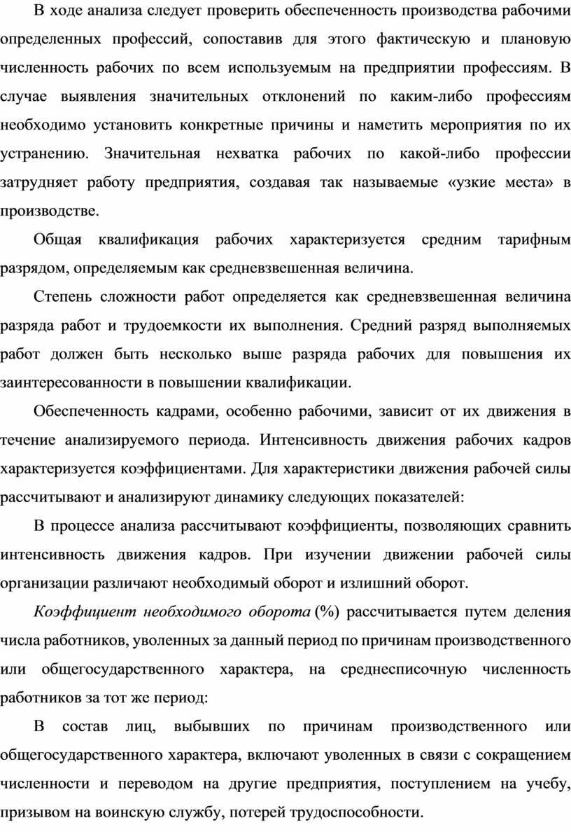 В ходе анализа следует проверить обеспеченность производства рабочими определенных профессий, сопоставив для этого фактическую и плановую численность рабочих по всем используемым на предприятии профессиям. В случае выявления значительных отклонений по каким-либо профессиям необходимо установить конкретные причины и наметить мероприятия по их устранению. Значительная нехватка рабочих по какой-либо профессии затрудняет работу предприятия, создавая так называемые «узкие места» в производстве.