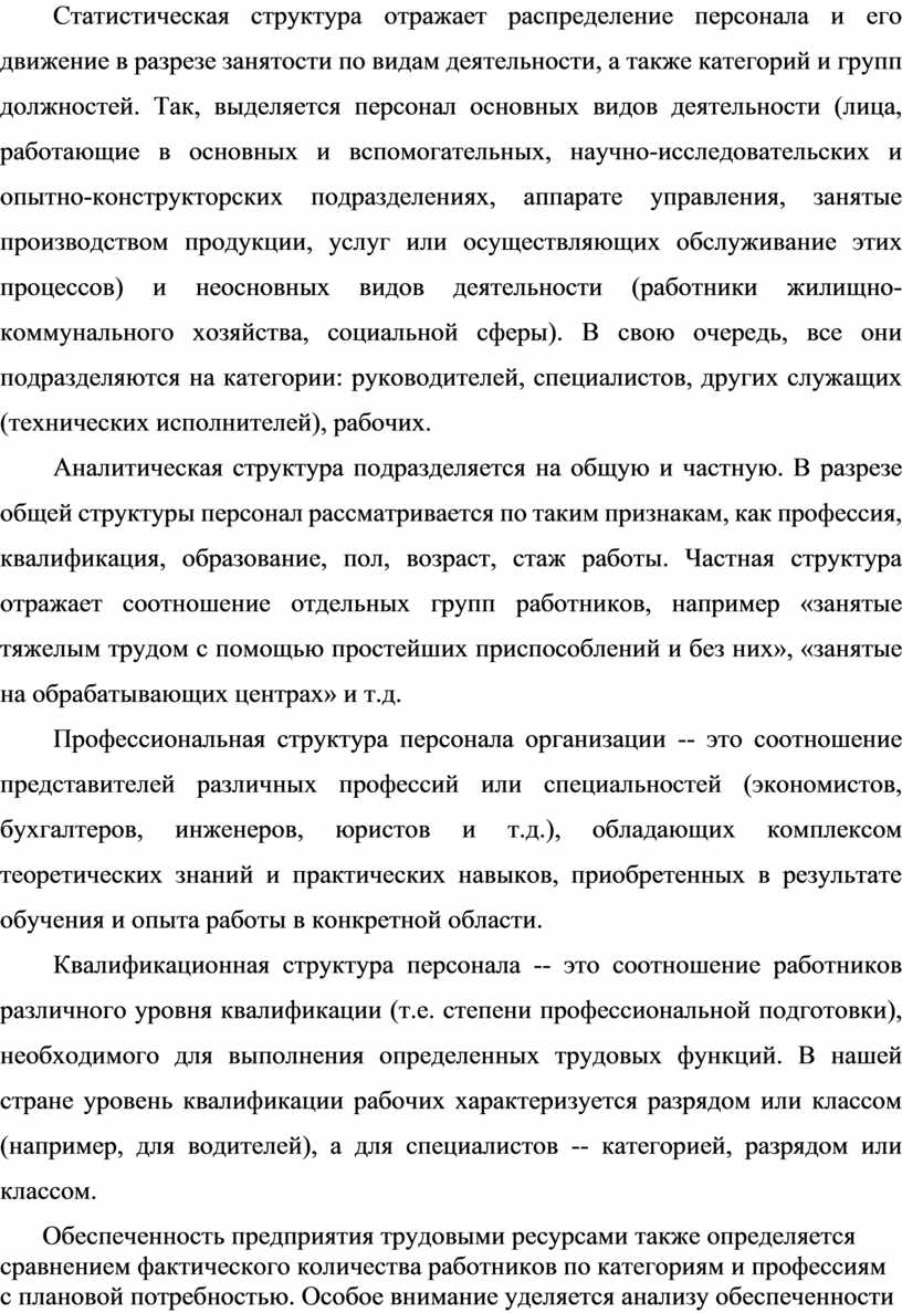 Структура персонала организации по совокупность отдельных групп работников, объединенных по какому-либо признаку. Она может быть статистической и аналитической.