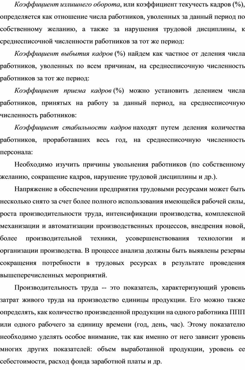 Коэффициент излишнего оборота, или коэффициент текучесть кадров (%), определяется как отношение числа работников, уволенных за данный период по собственному желанию, а также за нарушения трудовой дисциплины, к среднесписочной численности работников за тот же период: