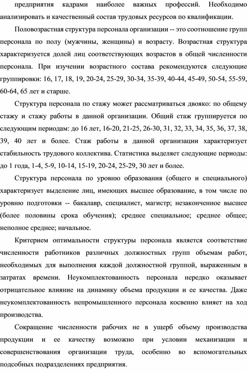 Структура персонала по стажу может рассматриваться двояко: по общему стажу и стажу работы в данной организации. Общий стаж группируется по следующим периодам: до 16 лет, 16-20, 21-25, 26-30, 31, 32, 33, 34, 35, 36, 37, 38, 39, 40 лет и более. Стаж работы в данной организации характеризует стабильность трудового коллектива. Статистика выделяет следующие периоды: до 1 года, 1-4, 5-9, 10-14, 15-19, 20-24, 25-29, 30 лет и более.