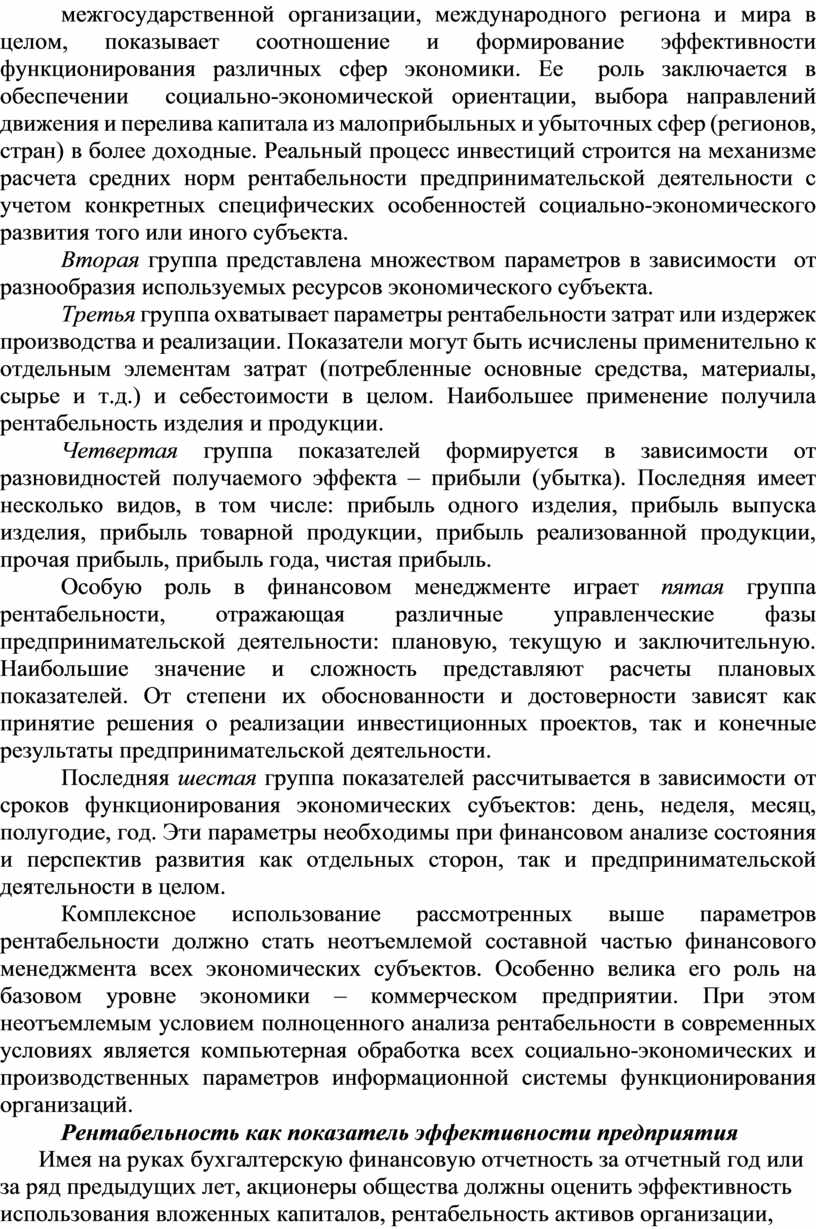 Первая группа показателей, отражая уровень рентабельности различных экономических субъектов общества от отдельного частного предпринимателя без образования юридического лица, предприятия до страны, межгосударственной организации, международного региона и мира в целом, показывает соотношение и формирование эффективности функционирования различных сфер экономики. Ее роль заключается в обеспечении социально-экономической ориентации, выбора направлений движения и перелива капитала из малоприбыльных и убыточных сфер (регионов, стран) в более доходные. Реальный процесс инвестиций строится на механизме расчета средних норм рентабельности предпринимательской деятельности с учетом конкретных специфических особенностей социально-экономического развития того или иного субъекта.
