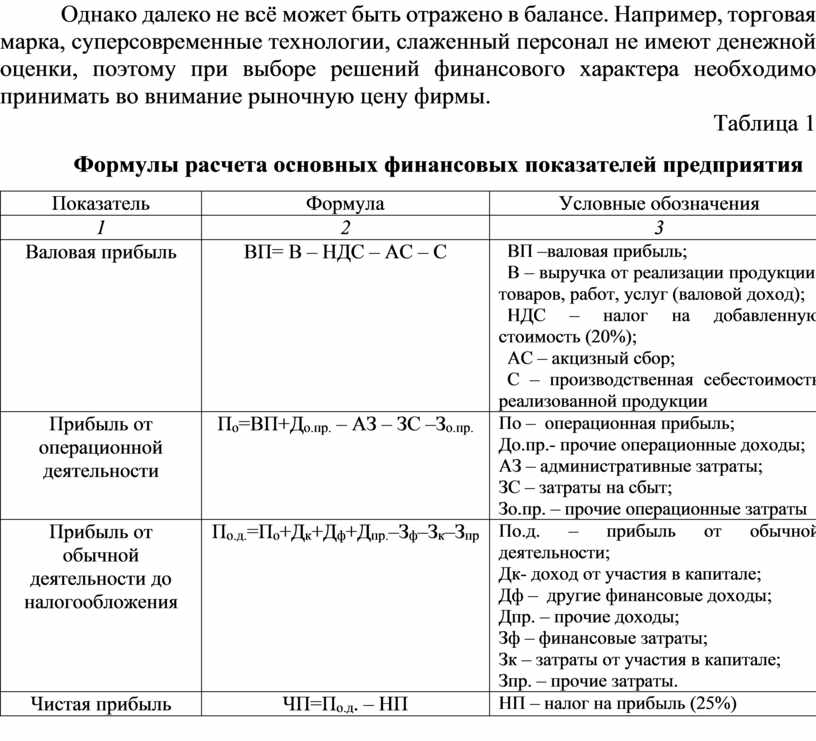 ВП –валовая прибыль; В – выручка от реализации продукции, товаров, работ, услуг (валовой доход); НДС – налог на добавленную стоимость (20%); АС – акцизный сбор; С – производственная себестоимость реализованной продукции |